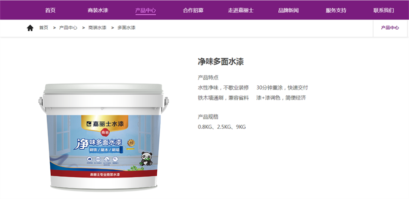 嘉麗士以用戶為中心,以便捷實用為原則。為了讓用戶擁有更便捷的訪問體驗,新官網(wǎng)對頂部導(dǎo)航菜單欄重新規(guī)劃了板塊架構(gòu)。在對各類信息重新歸類整合后,分為八大板塊布局,分別是“首頁、商裝水漆、產(chǎn)品中心、合作招募、走進(jìn)嘉麗士、品牌新聞、服務(wù)支持、聯(lián)系我們”。導(dǎo)航欄板塊簡潔清晰,重點頭部欄目一覽無余,下拉欄目子項的陳列布局,全方位、多層次呈現(xiàn)嘉麗士的各項信息,瀏覽體驗更為便捷、明快,使全站信息一觸即達(dá)。