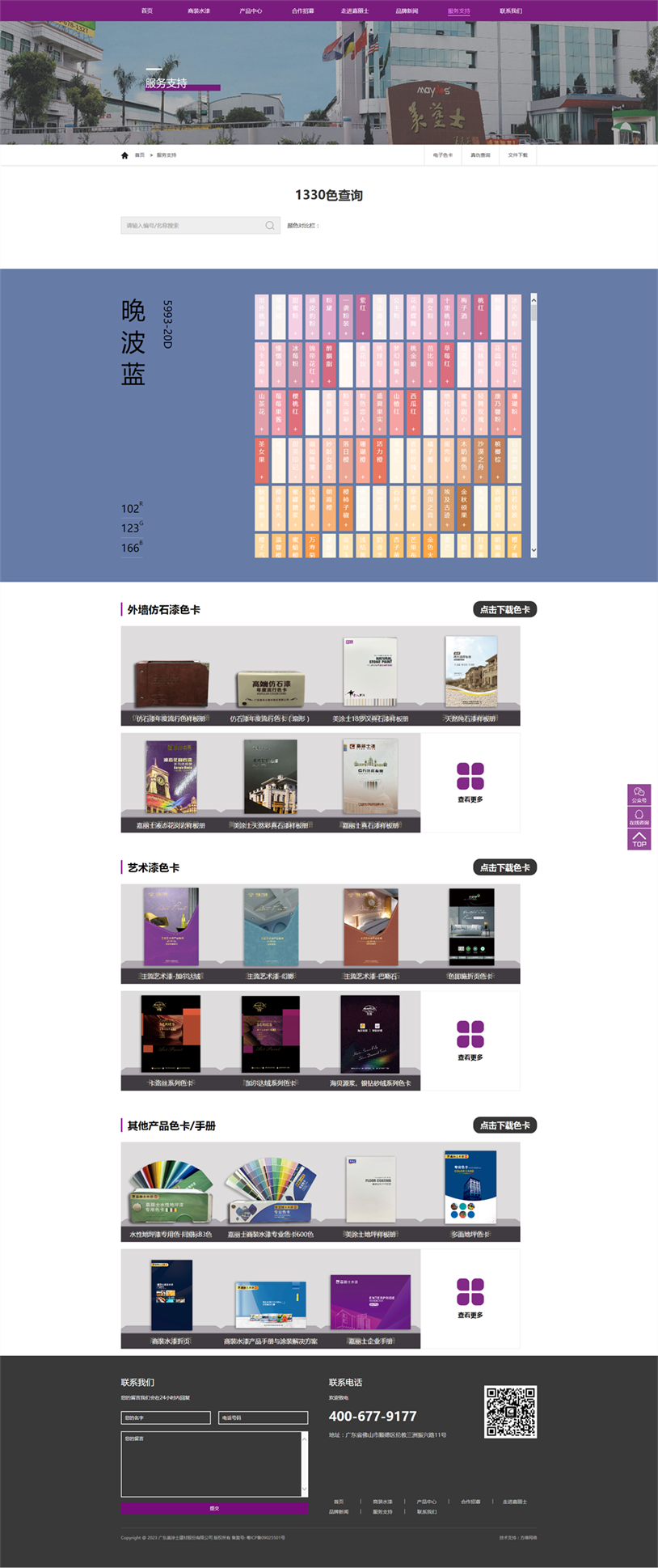 另外,為了方便各位用戶更快捷地了解我們的產(chǎn)品信息,新官網(wǎng)特別推出了電子色卡系統(tǒng)。在這里,用戶只需輸入產(chǎn)品的編號和名稱就可以查詢到對應(yīng)的顏色。同時,我們還提供了外墻仿石漆、藝術(shù)漆、商裝水漆等核心產(chǎn)品色卡和手冊供用戶下載。