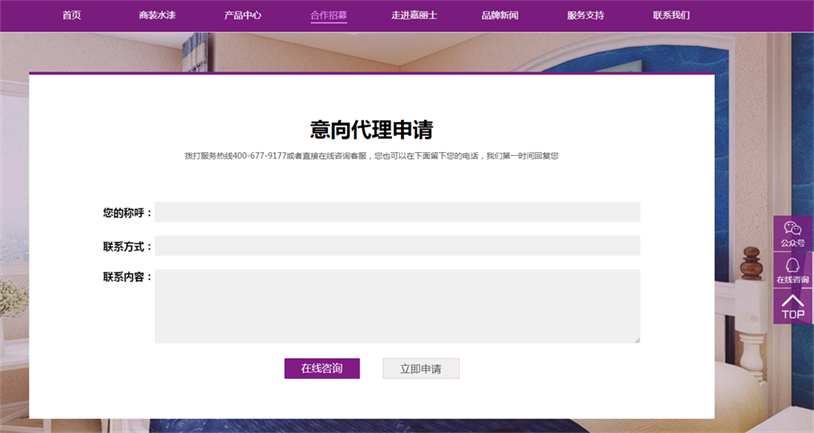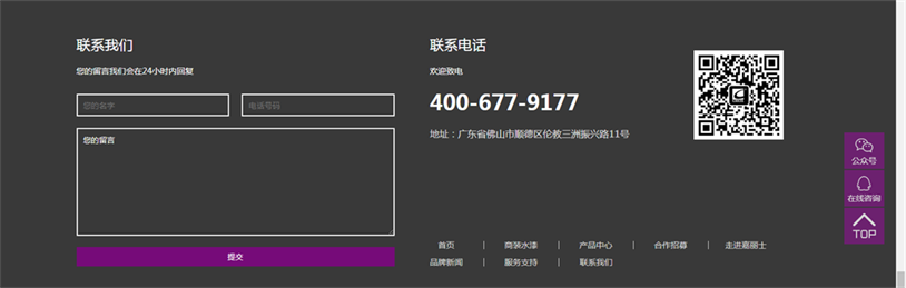 從網(wǎng)頁頂部導(dǎo)航欄“聯(lián)系我們”到底部增設(shè)的多渠道咨詢服務(wù),用戶可以從400服務(wù)熱線、在線咨詢、留言與我們聯(lián)系,我們將針對不同用戶的需求,打造專屬方案和服務(wù)。用戶還可通過手機(jī)掃描網(wǎng)頁底部的二維碼關(guān)注嘉麗士公眾號,定期獲取嘉麗士最新資訊。此外,新官網(wǎng)還開設(shè)了合作招募通道,面向全國誠招合伙人,攜手共建美好未來!