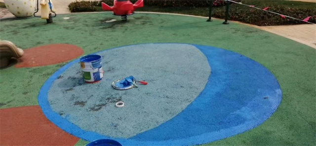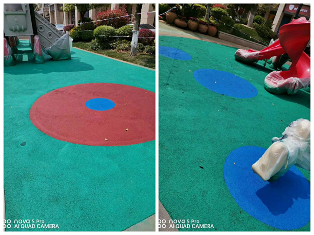 涂裝后的兒童游樂區(qū)地坪色彩鮮艷,藍(lán)、紅、綠搭配圓形圖案,充分展現(xiàn)了童趣,與周邊游樂設(shè)施一起,構(gòu)成了充滿夢(mèng)幻童話的空間!