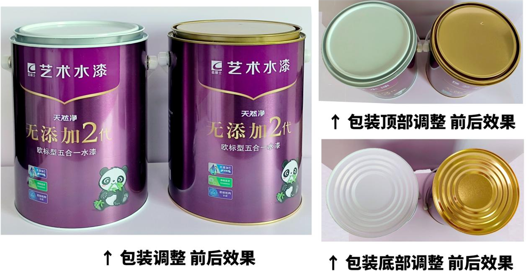 為進一步提升5L內(nèi)墻乳膠漆包裝質量,改善市場反饋的環(huán)口生銹問題,公司經(jīng)過近幾個月的產(chǎn)品熱儲、破壞性測試、竟品對標分析及與供應商的深入討論,于2025年4月22日起將5L乳膠漆包裝罐的底座、環(huán)口、桶蓋顏色由白色調(diào)整為金色。