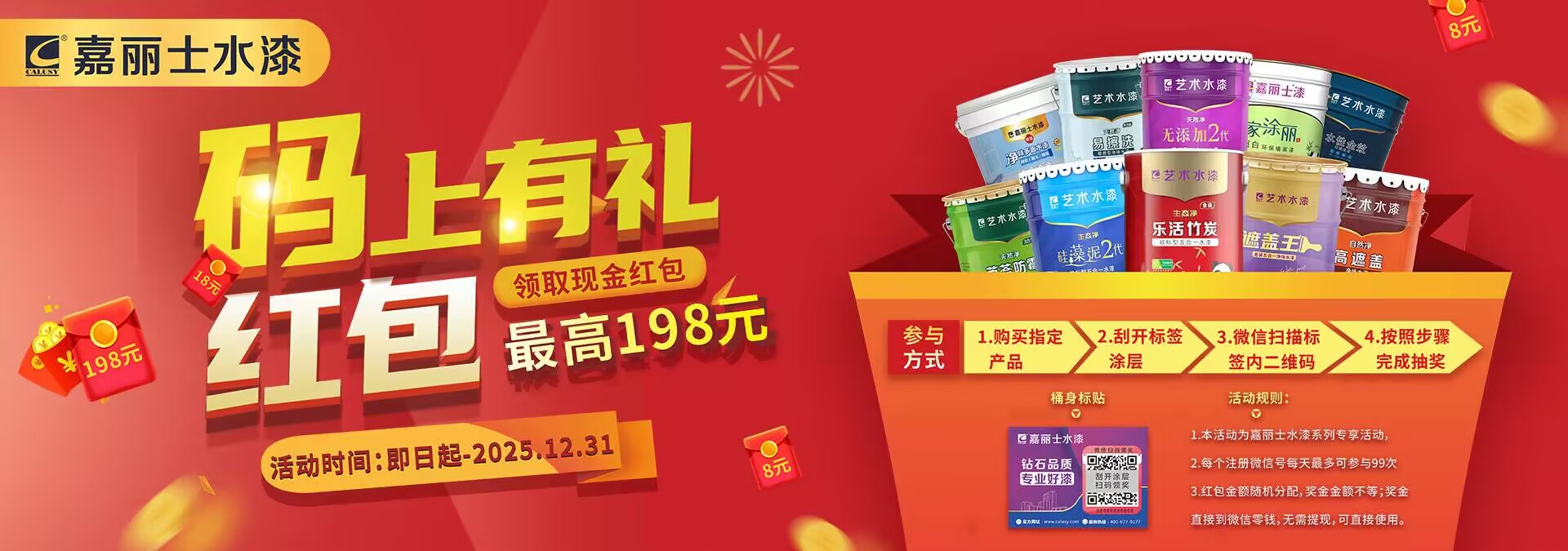 嘉麗士水漆 推出 “碼上有禮” 紅包活動,最高可領(lǐng)198元!不管是1.8 元、5.8元,38元,還是超級幸運(yùn)的198 元,每一個紅包都是嘉麗士水漆對大家的誠意與回饋。
