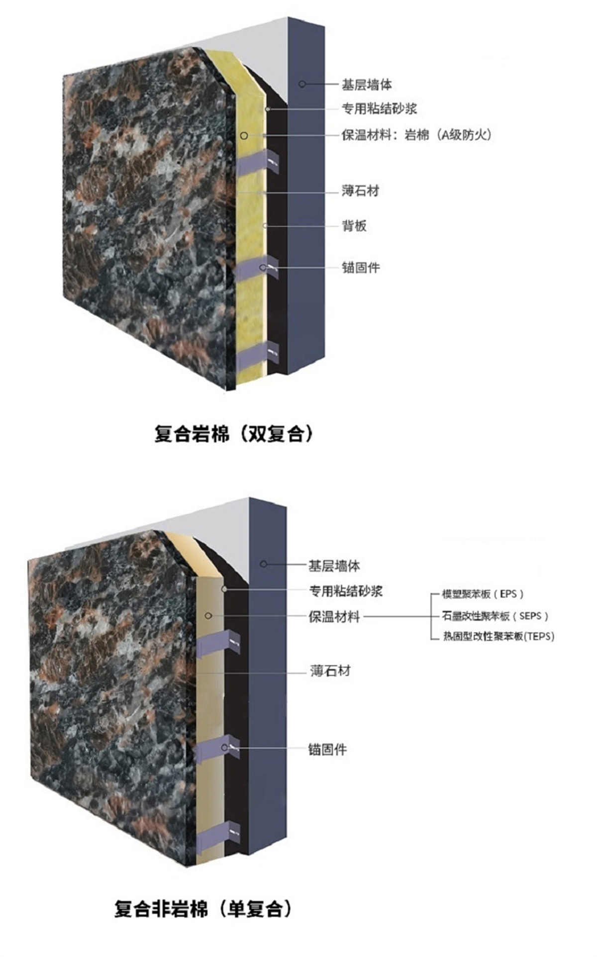 薄石材保溫裝飾一體板是采用天然石材與保溫材料復(fù)合而成的保溫裝飾一體板,其裝飾效果更高檔、華麗。相比干掛石材,其在達(dá)到同等裝飾效果的情況下,造價(jià)成本更低、施工更便捷。常用薄石材類型有卡麥、皇室棕、芝麻白等。