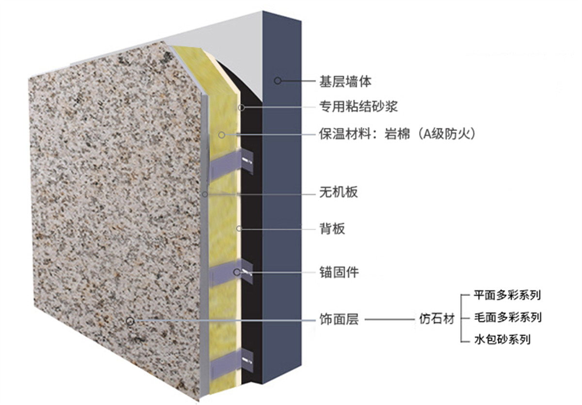 無機板類多彩仿石保溫裝飾一體板選用高密度、高強度A1級無機板為基材,通過精砂、滲透封閉、界面處理、飾面噴涂(輥涂)、固化、養(yǎng)護、復(fù)合等多道現(xiàn)代化生產(chǎn)工序加工成型。