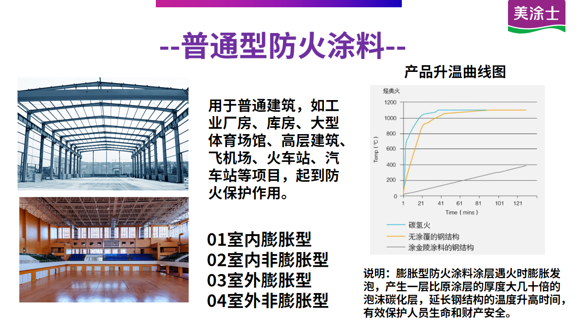 金陵非膨脹型防火涂料利用涂層固有的良好絕熱性,阻止火災(zāi)熱量向鋼材傳遞,并且在高溫下形成一種結(jié)構(gòu)致密的釉狀物,能有效隔絕氧氣并具有反射熱量作用,延緩鋼結(jié)構(gòu)溫升,起到防火保護(hù)作用。