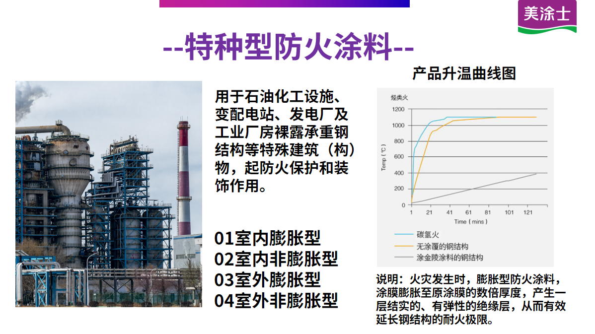 由丙烯酸樹脂、三聚氰胺、季戊四醇、聚磷酸銨、溶劑、助劑等組成,遇火災(zāi)時能膨脹發(fā)泡炭化,形成不易燃燒的致密海綿狀炭質(zhì)層,阻滯熱量向基材傳播,提高鋼結(jié)構(gòu)的耐火時間,有效保護(hù)鋼結(jié)構(gòu)建筑免受火災(zāi)侵害。